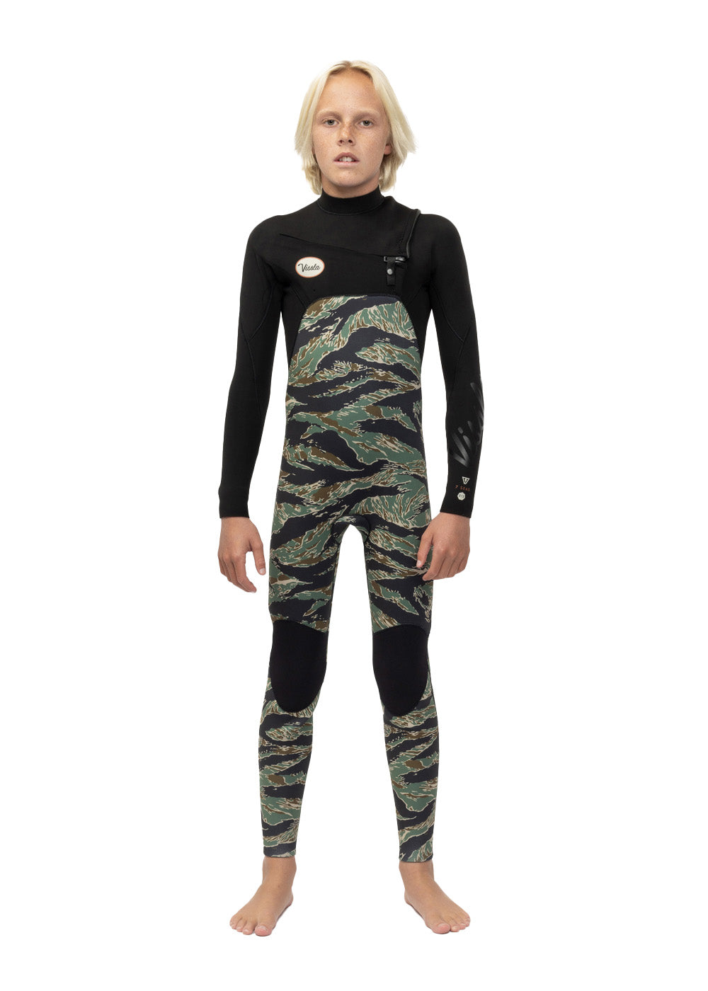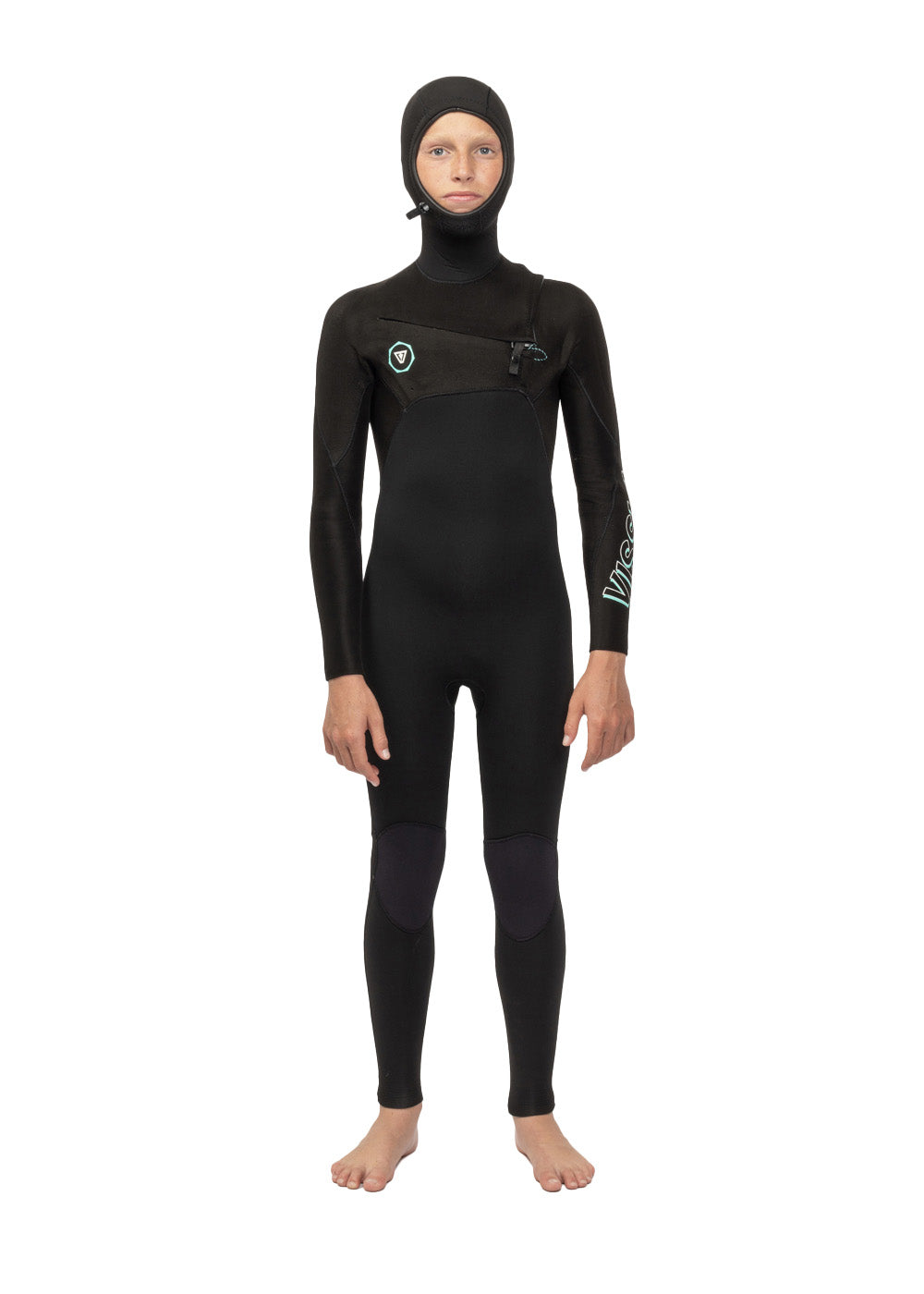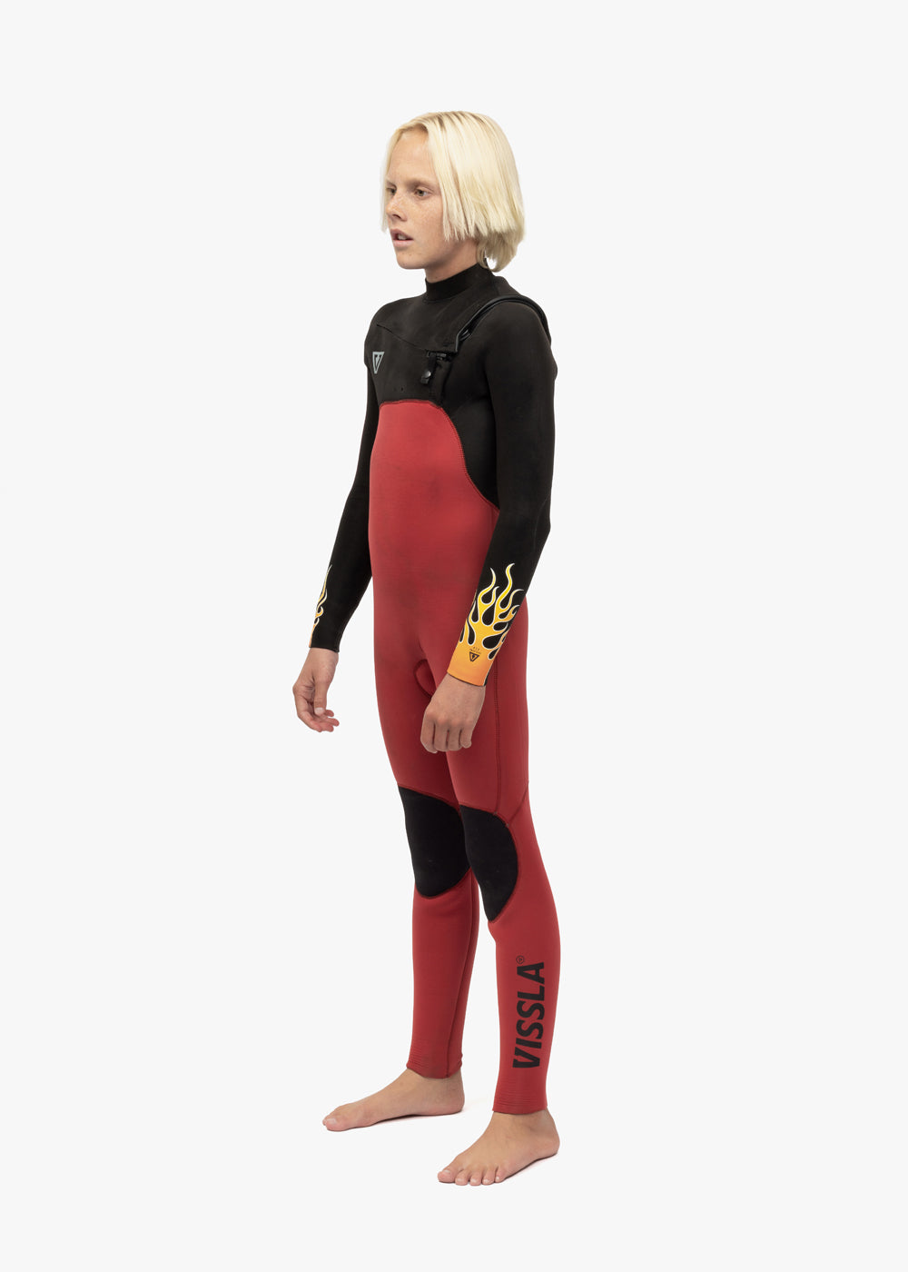 Vissla Black High Seas Boys Fire 3-2 Full Chest Zip Wetsuit. Front and Back View.