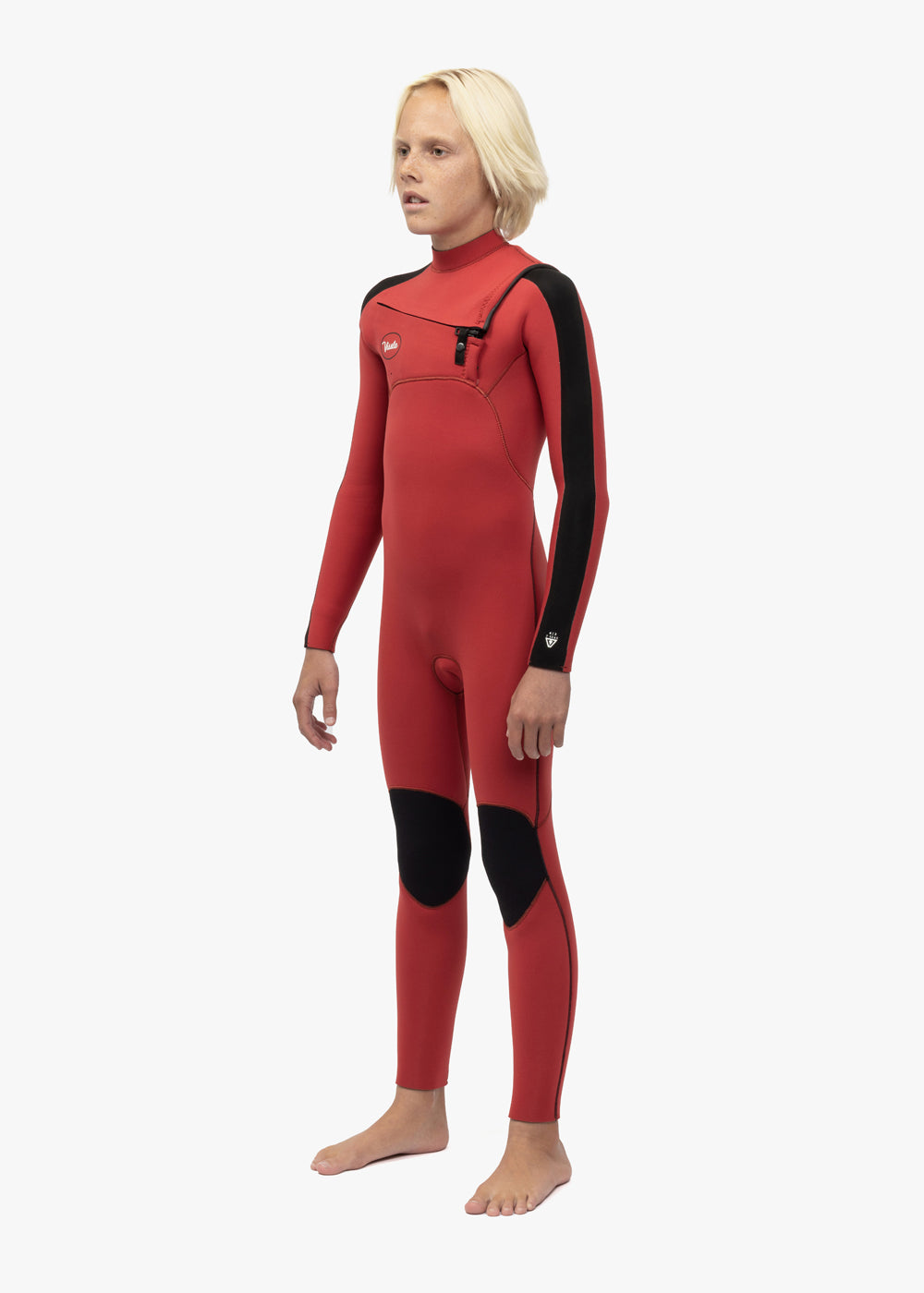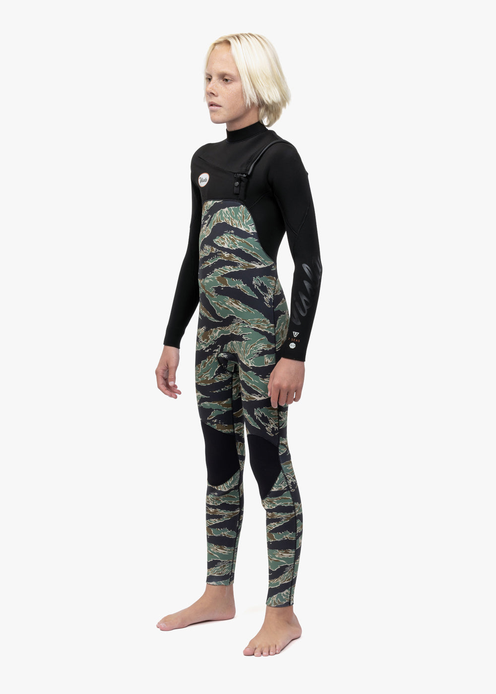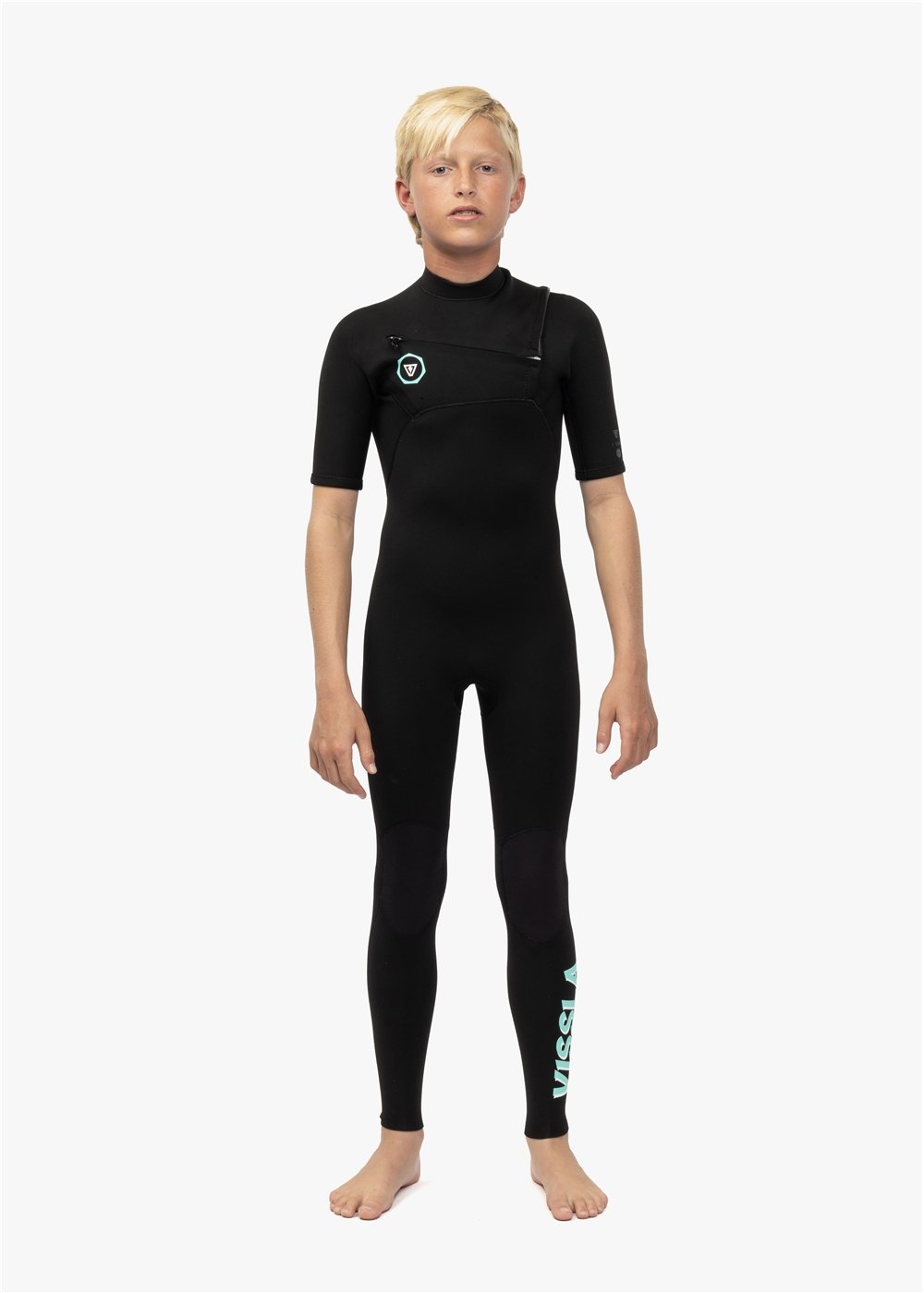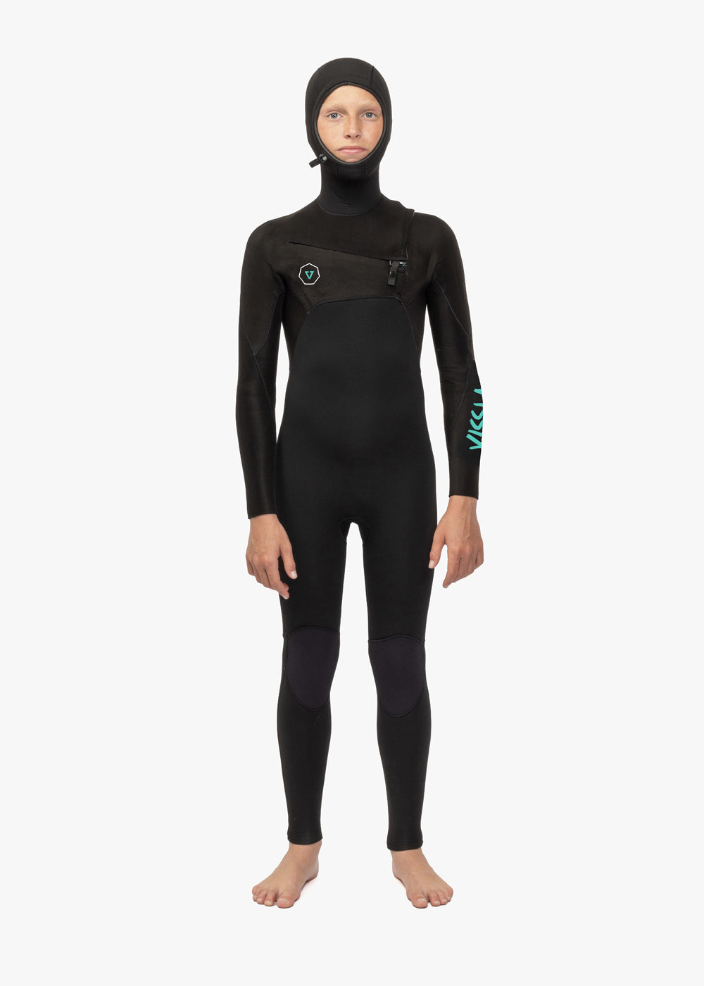 Vissla Black High Seas Boys Fire 3-2 Full Chest Zip Wetsuit. Front and Back View.
